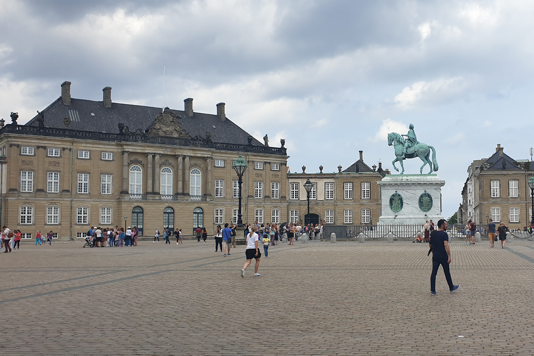 Am Schloss Amalienborg angekommen stellen wir fest, dass die Königin gar nicht zu Hause ist, denn es weht keine Flagge auf dem Dach und nur vier Wachposten ewachen den Innenhof.